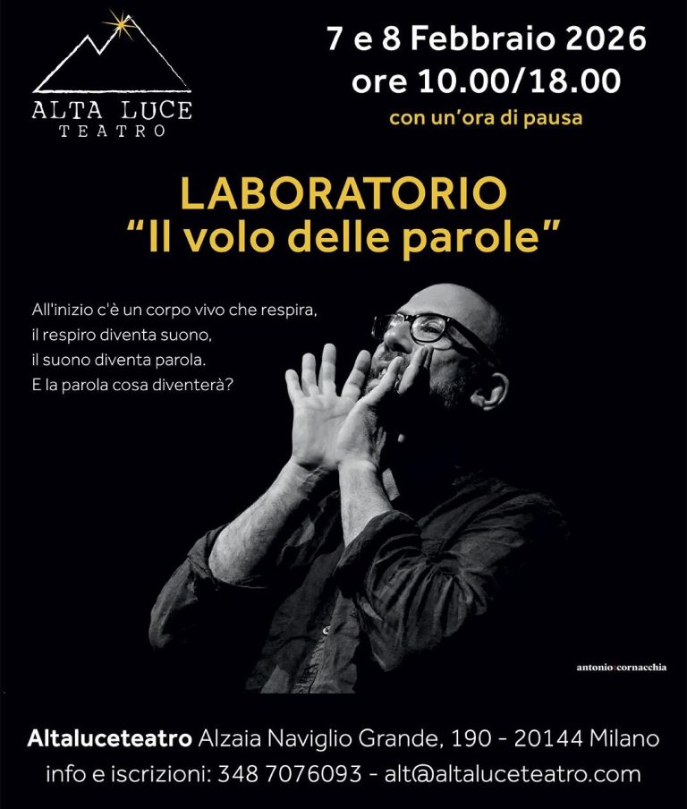 LABORATORIO “IL VOLO DELLE PAROLE” All’inizio c’è un corpo vivo che respira, il respiro diventa suono, il suono diventa parola. E la parola cosa diventerà? La parola, si compone in frasi, e diventa azione. La parola è una forma di azione. La chiamiamo AZIONE VERBALE e come ogni altra azione può cambiare la realtà intorno a noi. Useremo le intuizioni dei Maestri e un po’ di scienza per capire come dare forza alle parole in scena. Altaluceteatro , Alzaia Naviglio Grande 190 7 e 8 febbraio ore 10.00/18.00 ( con un’ora di pausa) info e iscrizioni: 2487076093 alt@altaluceteatro.com